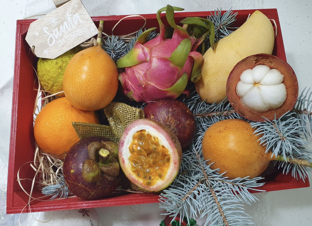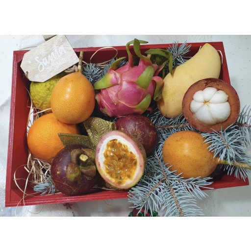 1 BUC MANGO KENT PERU,1 BUC FRUCTUL DRAGONULUI ROSU,1 BUC GUAVA,2BUC MANGOSTEEN,2 FRUCTUL PASIUNII,1 GRANADILLA ,1 PORTOCALA ,BETISOARE DE SCORTISOARA, BOMBOANE ,PUNGUTA CU MIEZ DE NUCA,FISTIC SI MIGDALE,DECORATIUNI DE IARNA
